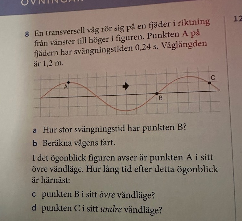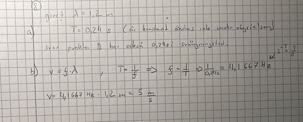 Vid tidpunkten som figuren visar befinner sig vågtoppen hos punkten A, dvs punkten A är i sitt övre vändläge. Hur lång tid tar det tills vågtoppen har färdats till punkten B? (Du räknade ut vågens fart i b-uppgiften)