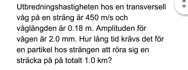 Men jag vet bara att elongationen y=A sin wt och jag har ingen tid t. Det som söks är ju hur lång tid det tar för partikeln att röra sig 1 km i sinuskurvan.