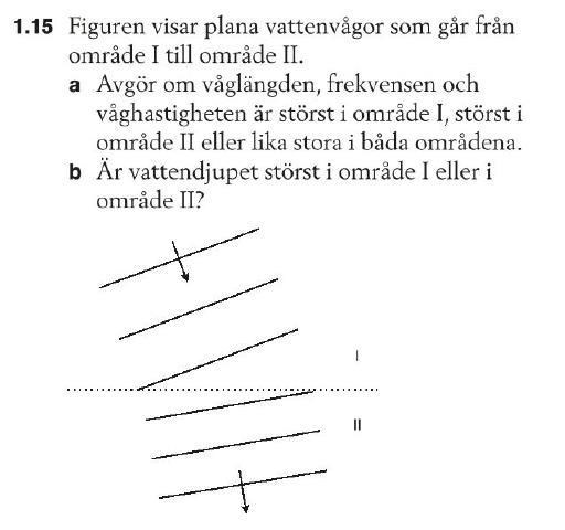 Du kan lätt intuitivt förstå att frekvensen måste vara densamma genom att betrakta ett snitt vid den prickiga linjen. Då har du snabbare vågor med längre våglängd på ena sidan och långsammare vågor med kortare våglängd på andra sidan. Vad skulle då hända om vågorna hade olika frekvenser? Jo, precis vid brytpunkten så skulle vågorna vara diskontinuerliga och inte svänga "sammanhängande", det betyder att du skulle kunna ha en vågtopp till höger om brytpunkten och en vågdal till vänster och sedan ett stort "hack" precis vid brytpunkten.