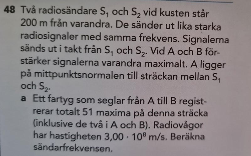 Om är ett helt antal våglängder så får man ett maxima i punkten P. I uppgiftens punkt A är = 0, i punkten B blir = 50.