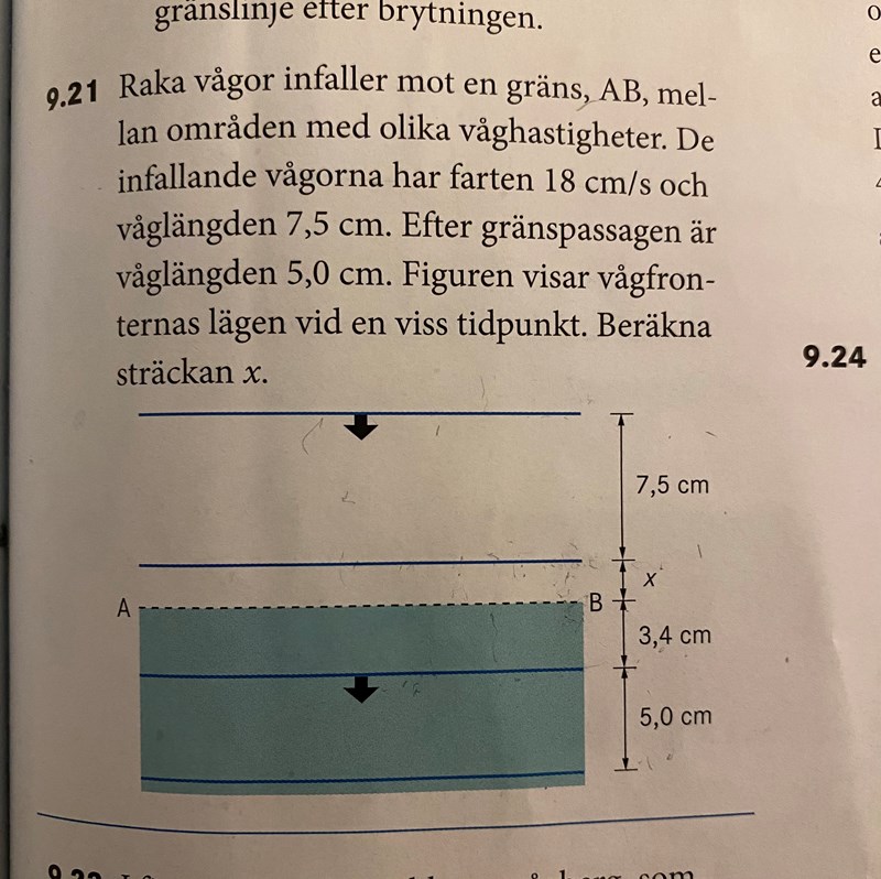 Jag förstår att vågorna efter brytning har samma frekvens och vet att hastigheten för den andra vågtoppen är 12cm/s. Vad jag inte förstår är varför vågtopp 1 färdas sträckan x samtidigt som vågtopp 2 färdas 5-3,4 = 1,6cm?