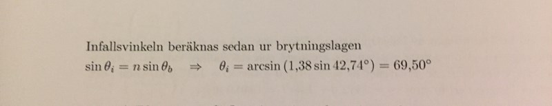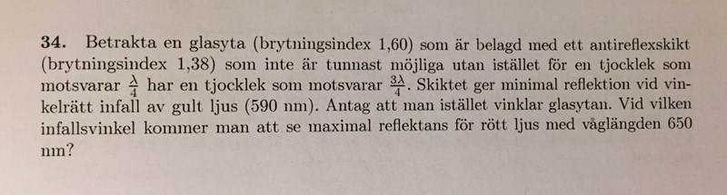 Jag förstår inte uttrycket där det i lösningen står 2ntcos(brytningsvinkeln)=m*Lambda. Hur kommer man fram till uttrycket i vänsterledet? Det är ju inte samma sträcka som vågen färdas från gränsen mellan luft och antireflexskiktet till gränsen mellan glas och antireflexskikt gånger två. Så vad är det meningen att det ska representera? Samt varför blir detta lika med m*Lambda?