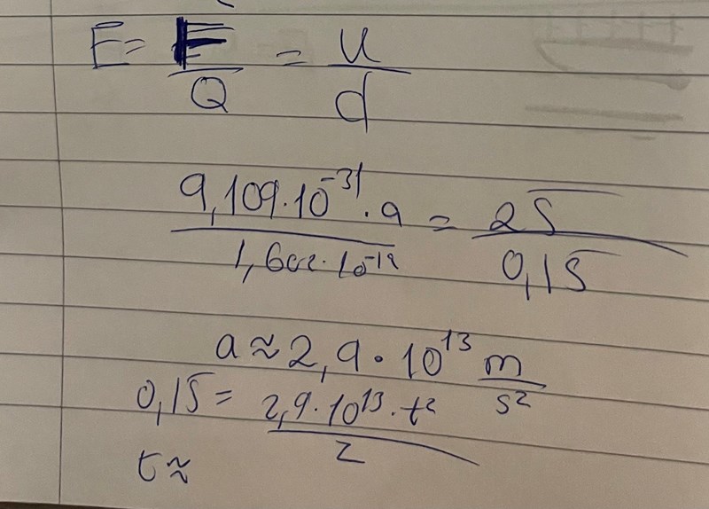 ett vakuumrör finns två plana, parallella metallplattor på avståndet 15,0 cm från varandra. En proton befinner sig i vila mellan plattorna, alldeles utanför den ena plattan. Plötsligt slår man på en spänning på 25,0 V mellan metallplattorna så att protonen dras mot den andra plattan. Hur lång tid tar det innan protonen träffar denna platta?