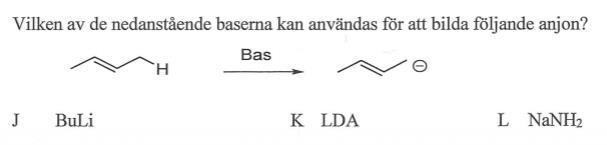 Kan det vara NaNH2 som är rätt svar då den är svagast? Eftersom LDA är steriskt hindrad och BuLi bildar en ylid (fortsätter i mer än ett steg)?