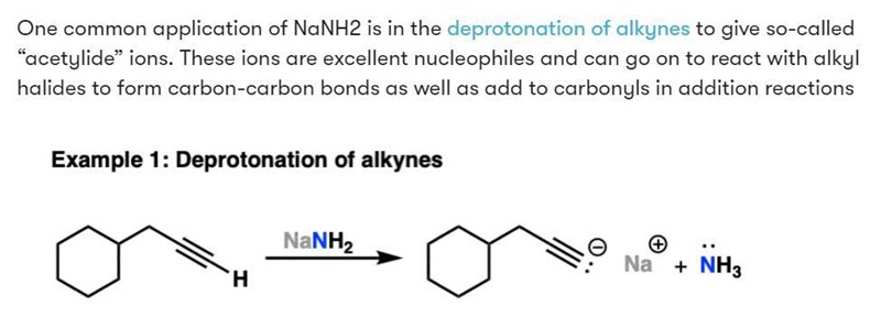 NaNH2 "Carbon acids which can be deprotonated by sodium amide in liquid ammonia include terminal alkynes, methyl ketones, cyclohexanone, phenylacetic acid and its derivatives and diphenylmethane. Acetylacetone loses two protons to form a dianion. Sodium amide will also deprotonate indole and piperidine."