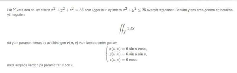 Hej jag har en upgift där jag skall hitta lämpliga intervall för u och v. Jag får att u är mellan -pi/2 och 2/pi eftersom parametriseringen säger z = 6cosu och uppgiften säger att z är posetivt vilket ger att cosu>= 0 vilket sker då u är mellan -pi/2 och 2/pi. Dock är jag fast hur jag skall tänka vid intervallet för v.