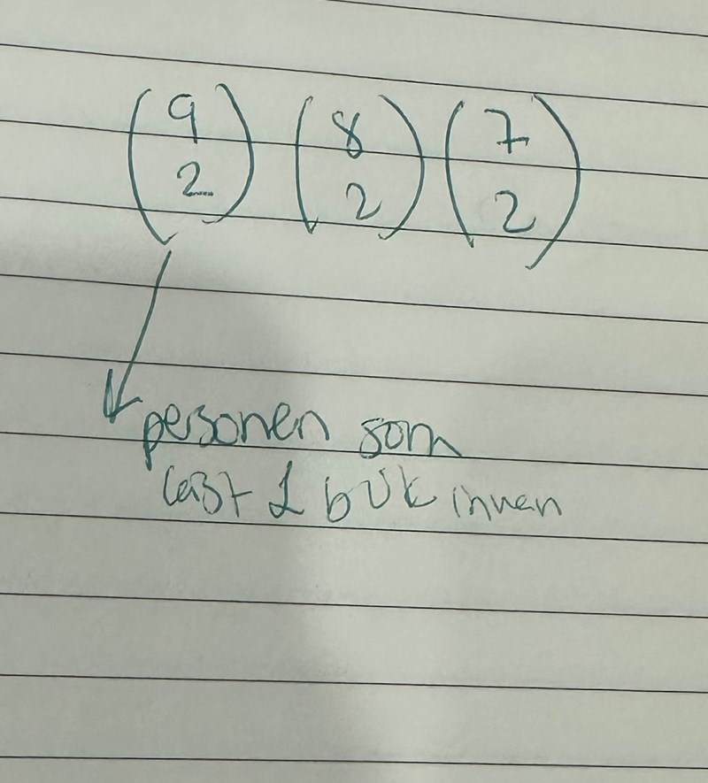 Först får A välja. Hen kan välja 2 av 9 böcker. (9 över 2) kombinationer.
