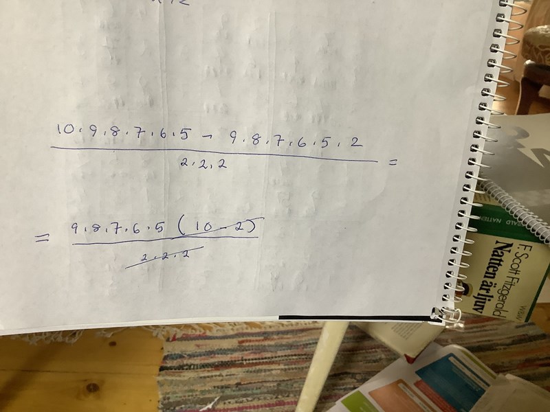 Multiplicerar vi får vi 9*8*8*7*6*5 / (2*2*2) = 9*8*7*6*5 kombinationer.