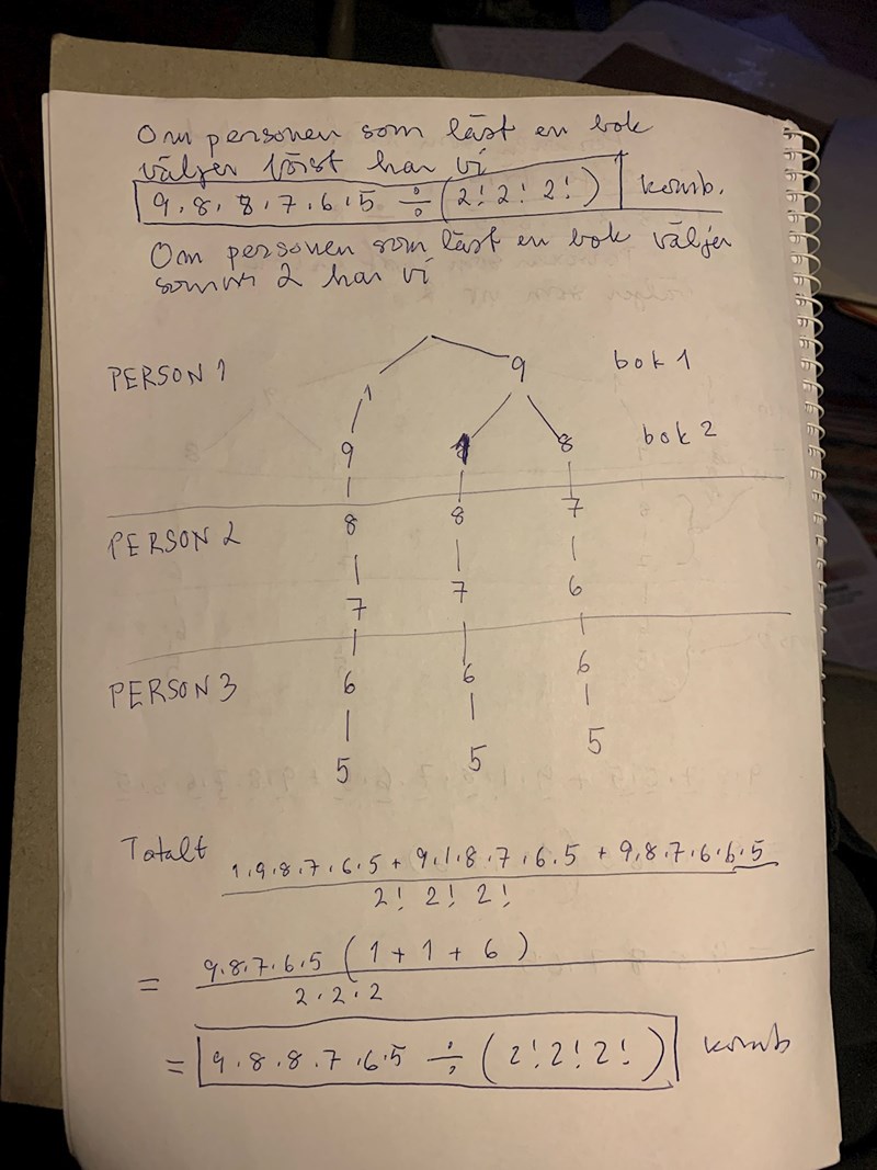 Anmärkning: Du kanske tycker det är onödigt med två lösningar. Men det är det inte. I kombinatorikproblem är man sällan helt säker. Därför är det ofta bra att testa om två olika lösningar ger samma resultat.