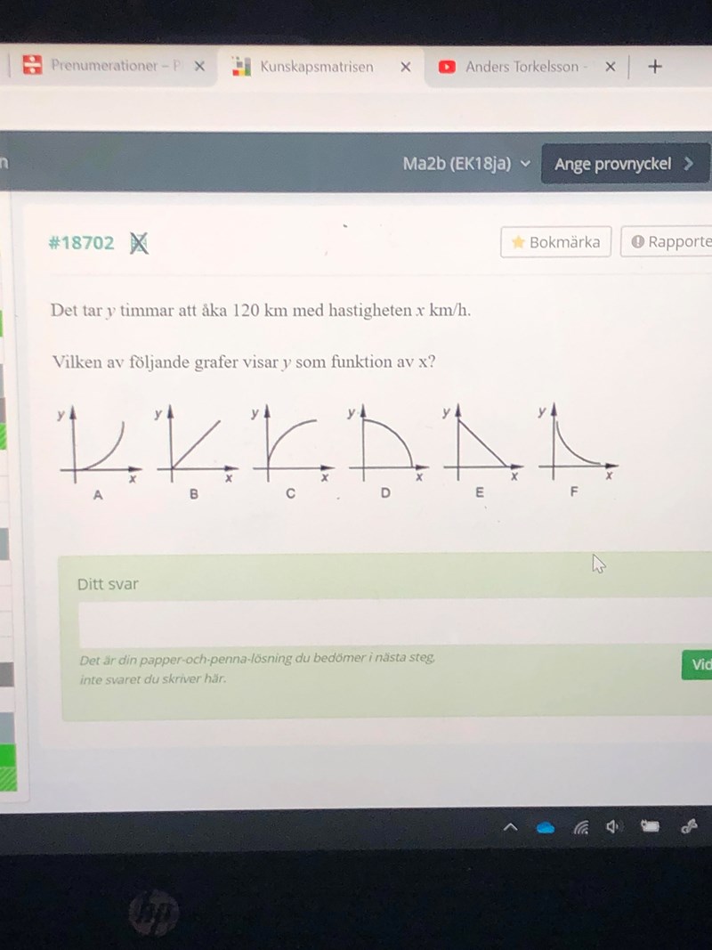 De vill att du väljer den graf som bäst representerar funktionen , där x är hastigheten, och y är tiden det tar att åka 120 km. Om hastigheten är 50 km/h, hur lång tid tar det att köra 120 km/h? Vad blir då y?