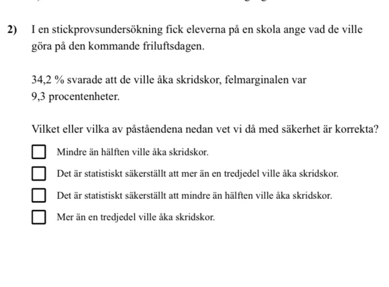 Konfidensintervallet innehåller värden som är mindre än 1/3. Uttalande 2 är ej korrekt.
