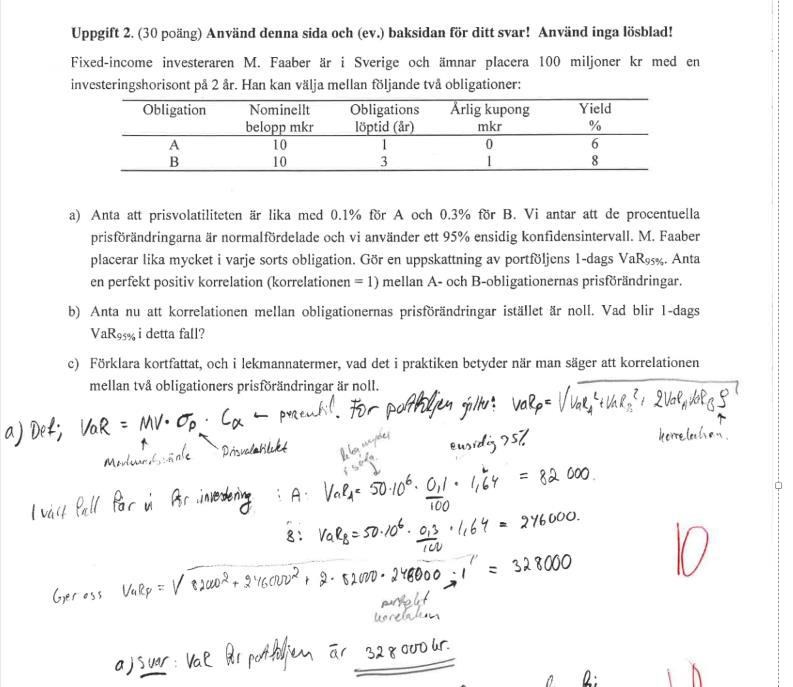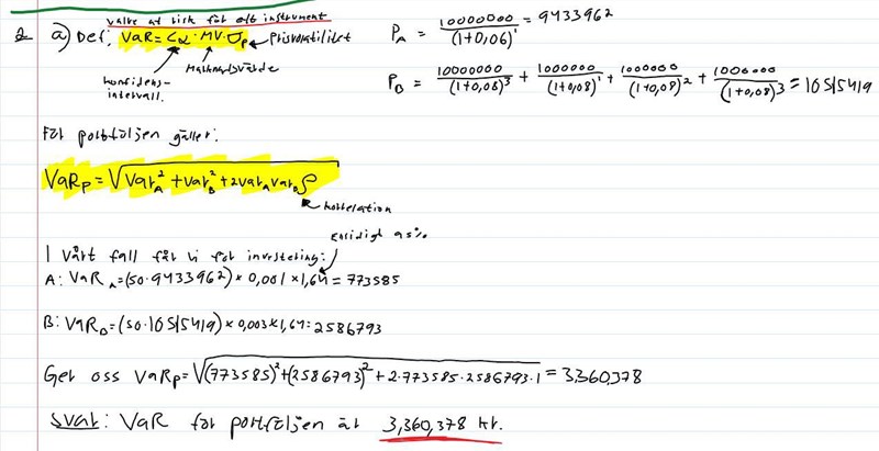 Jag kollar på ex-tentor och kan inte förstå hur den som har skrivit uppgift 2a kan fått full pott. Är det inte helt fel uträknat? Jag får VaR till cirka 3 miljoner.