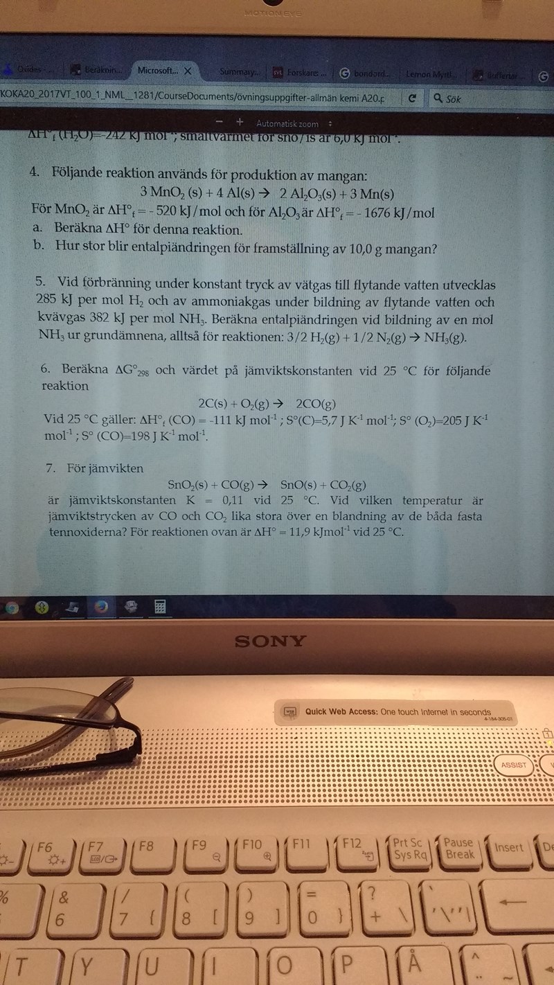 Uppgift 7. Jag tror man ska använda den ekvationen men förstår inte hur man använder den och förstår inte heller uppgiften - vad menar de och vad menar de jag ska göra? K1 och K2 är första K som här har ett värde och slut-K som vi inte vet. delta H är för reaktionen vid 25C och den har vi.  T1 är 298K T2 söker vi.