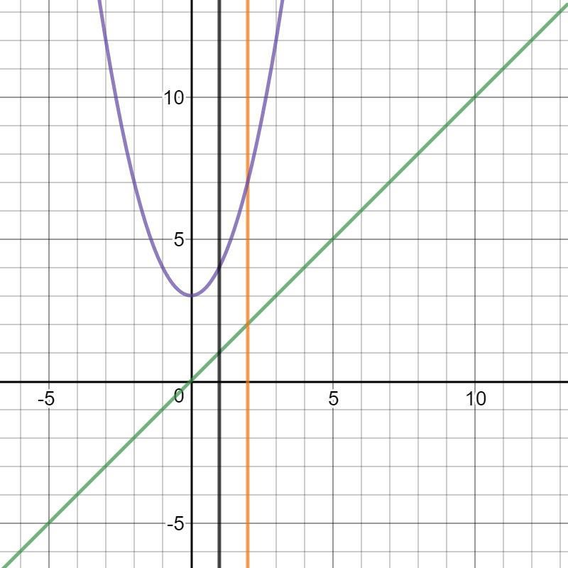 Beräkna arean av det område som begränsas av kurvan y = x^2+3 samt linjerna y=x, x=1 och x=2