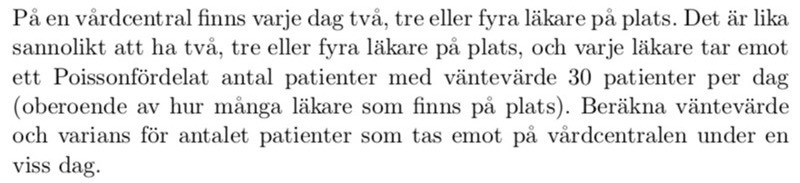 I facit ansätter de N = antalet läkare på plats en viss dag och konstaterar att P(N=n)=1/3 och så långt är jag med. Dock konstaterar de även att E(N)=3 och Var(N)=2/3 vilket jag undrar hur de får fram?