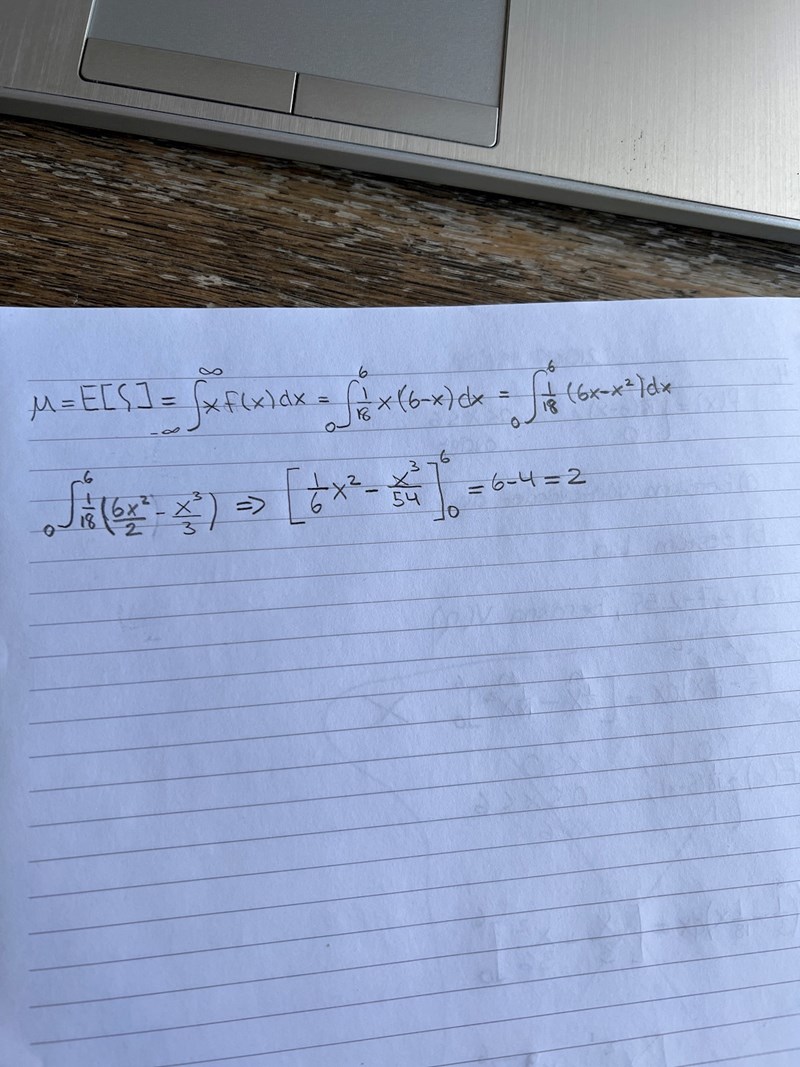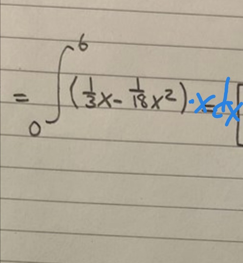 När jag gör det som på bild och sätter sedan in 6=x så får ju jag noll. Hur gör jag när jag är ute efter väntevärdet i detta problem?