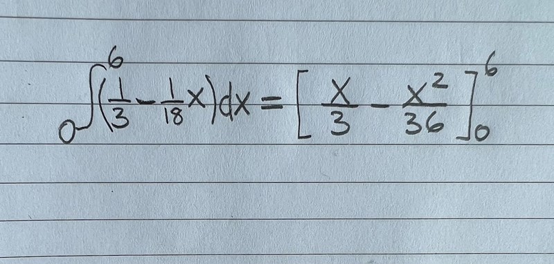 Frekvensfunktionen är en rät linje, och det sökta området (dvs integralen) är helt enkelt en triangel med hörnen i (0.3), origo och (6,0).