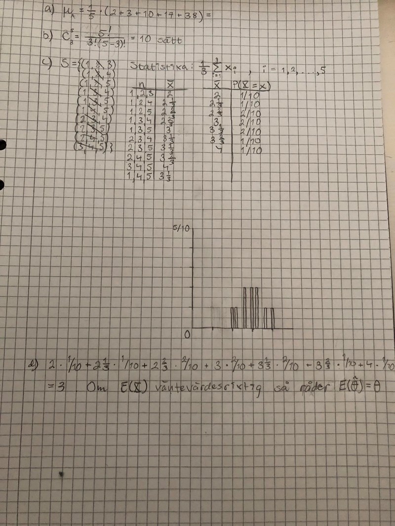 Jag behöver ha hjälp med deluppgift d) och e), där jag först och främst har räknat ut väntevärdet för samplingfördelningen i d). Hur vet jag om den är väntevärdesriktig? Jag ser ingen mening med att jämföra väntevärdet för samplingfördelningen med populationsmedelvärdet då samplingfördelningen för är en annan stokastisk variabel.