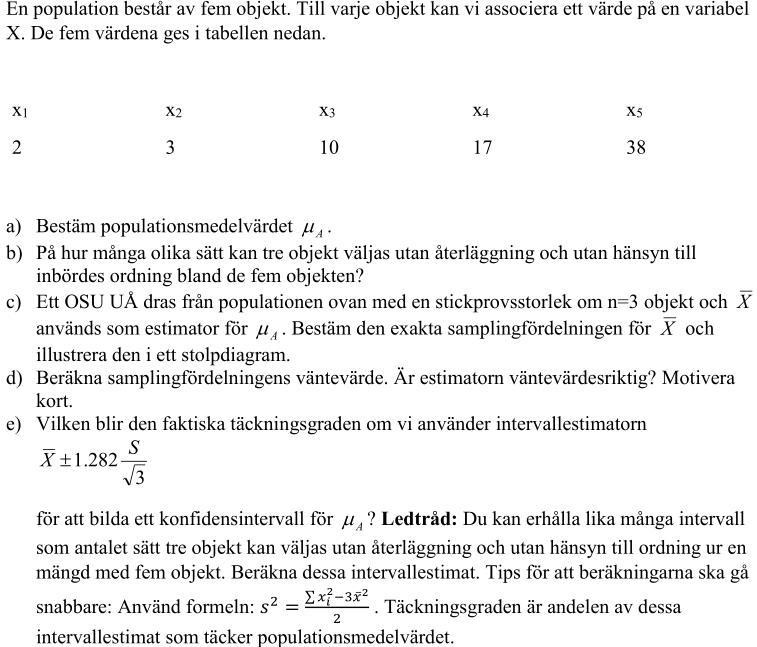 Nu har jag rättat till det fel jag hade gjort och tänkte fråga om e)-uppgiften: dels förstår jag inte "du kan erhålla lika många intervall som antalet sätt tre objekt kan väljas utan återläggning och hänsyn till ordning ur en mängd med fem objekt. Beräkna dessa intervallestimat.", sen begriper jag inte formeln för variansen heller, jag får en negativ varians. Varför används och inte i formeln?