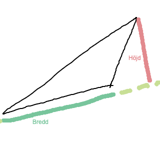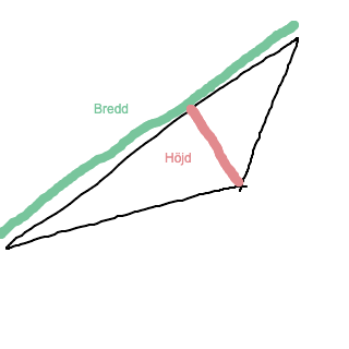 Välkommen till Pluggakuten! Ja, detta med höjd och bredd är inte helt utan klurigheter. I korthet kan en säga att höjden och bredden i en triangel alltid mäts vinkelrätt mot varandra. Det innebär att höjd och bredd i en triangel kan variera, beroende på hur du mäter. I triangel nummer två kan du använda den längsta sidan som bas, och mäta upp till triangelns högsta punkt: