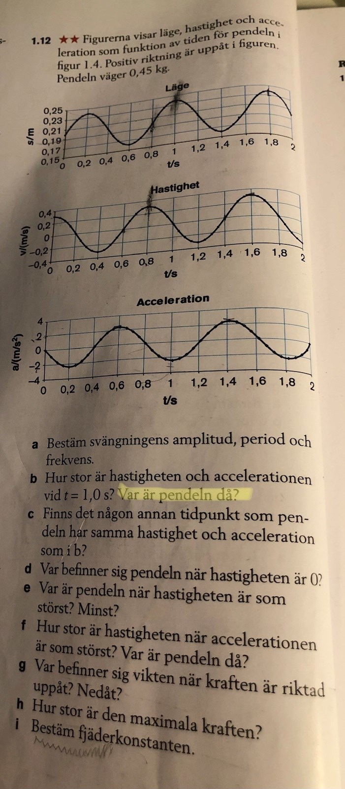 Jag behöver hjälp med b dvs var är pendeln i kurvan? Jag vet att hastigheten är noll och att accelerationen är negativ (saktar ned hastighet).