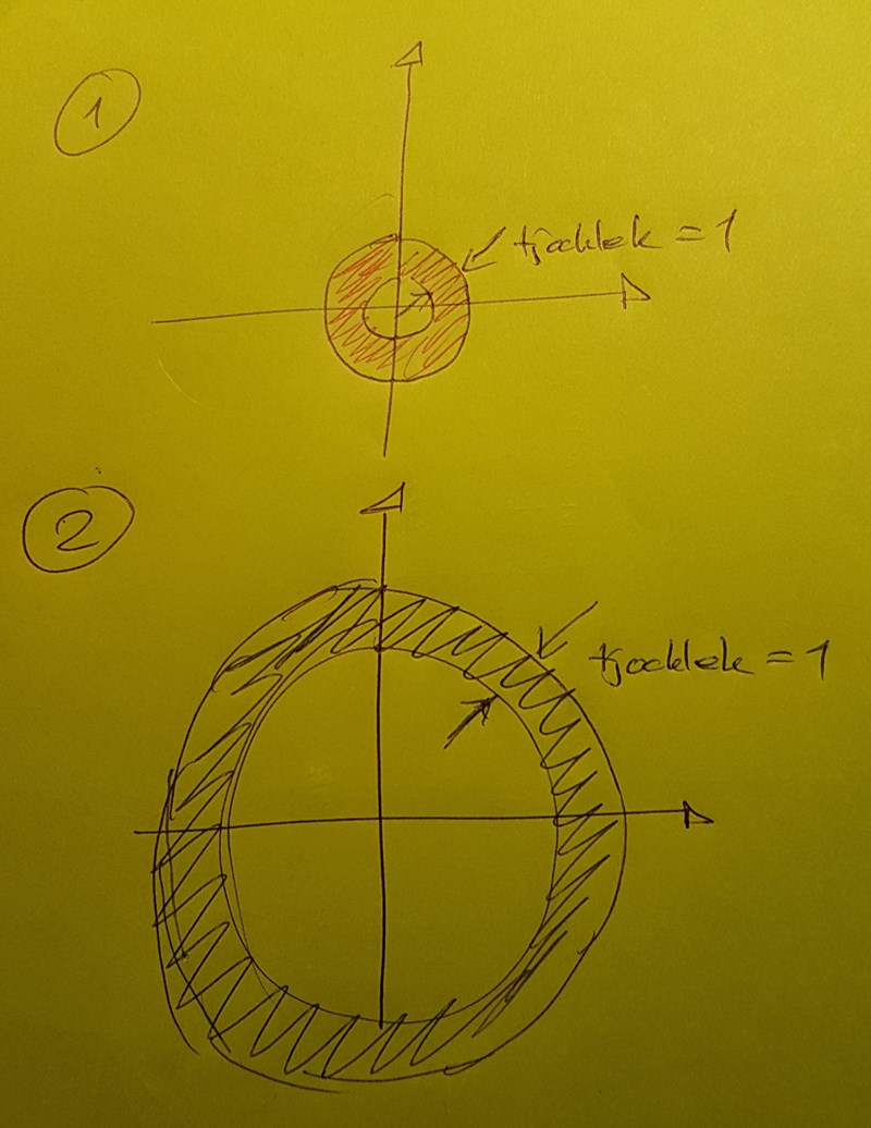 Det inser du lätt själv genom följande exempel: Vilken skiva har störst yta? Den röda eller den blåa? Avståndet mellan yttre och inre radien är densamma i båda fallen.