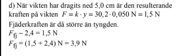 Så alltså är fjäderkraften 3,9 N men den resulterande kraften blir då 3,9-mg? (1,5N, som bidrar till accelerationen?)