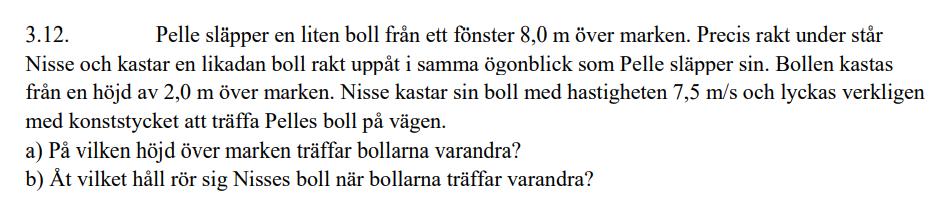 Bubo skrev:naytte skrev:jag tänkte att jag kunde ställa upp formler för både Nisses och Pelles boll där jag hade höjden som en funktion av tiden.