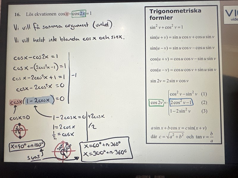 Till att börja med: Är du med på övriga steg ilösningen, dvs omskrivningen med hjälp av en formel för dubbla vinkeln cosinus och att ekvationen sedan med hjälp av nollproduktmetoden delas upp i följande?