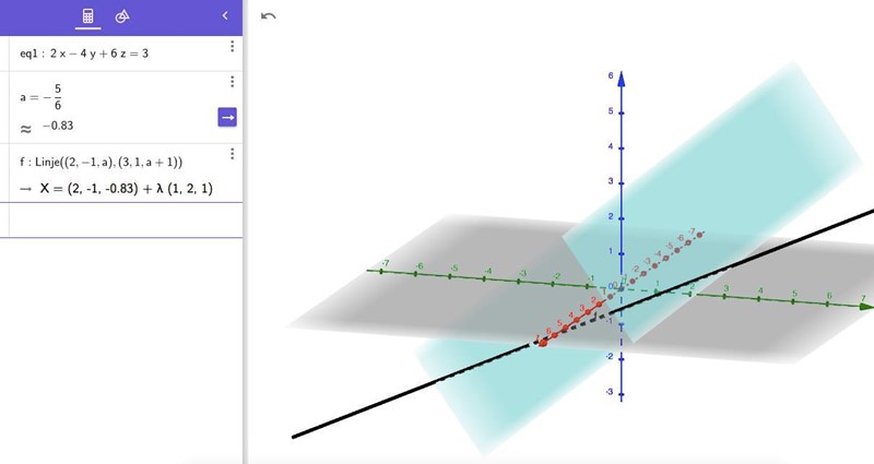 Ingen fara :) Jag bad läraren som vikarierar att dubbelkolla mitt svar eftersom det verkar finnas oändligt många lösningar då a=-5/6, dvs. då linjen sammanfaller med planet.