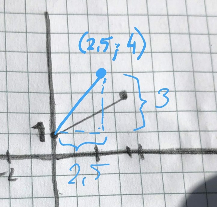 Det övre högra hörnet ska då alltså i sin tur ligga 2,5 steg till höger om och 3 steg ovanför mittpunkten.