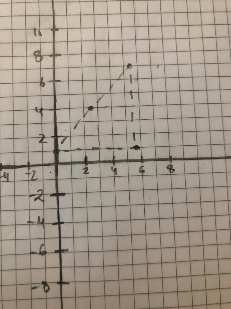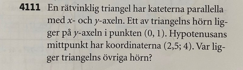 om jag skulle förklara hur jag tänkt så skulle jag först börja med att säga att jag började med att pricka in de angivna punkterna. Sen beräkna jag sträckan från hypotenusans mittpunkt till det ena hörnet som har punkten (5,5;7) , och (5,5,1) . Undrar hur man ska tänka