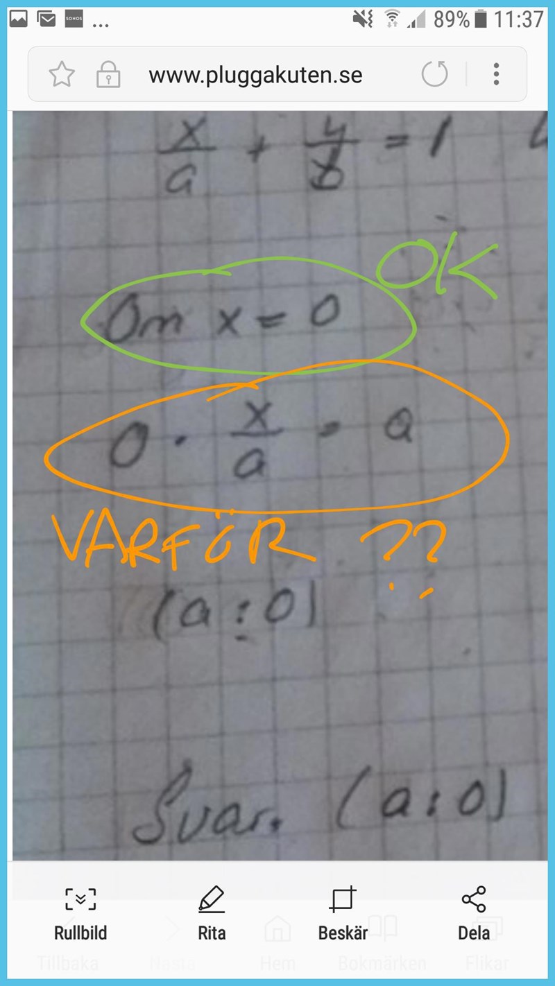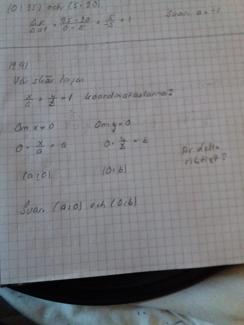 Du har fått fram rätt svar men jag förstår inte hur du har tänkt efter att du sätter x = 0 respektive y = 0. Kan du beskriva hur du gör och varför?