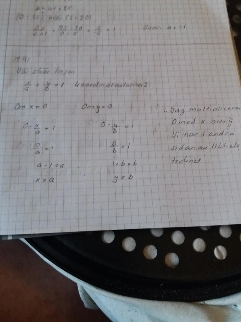x/a + y/b = 1. Grafen till detta samband skär y-axeln då x = 0. x = 0 i sambandet ger att 0/a + y/b = 1, dvs y/b = 1, dvs y = b.