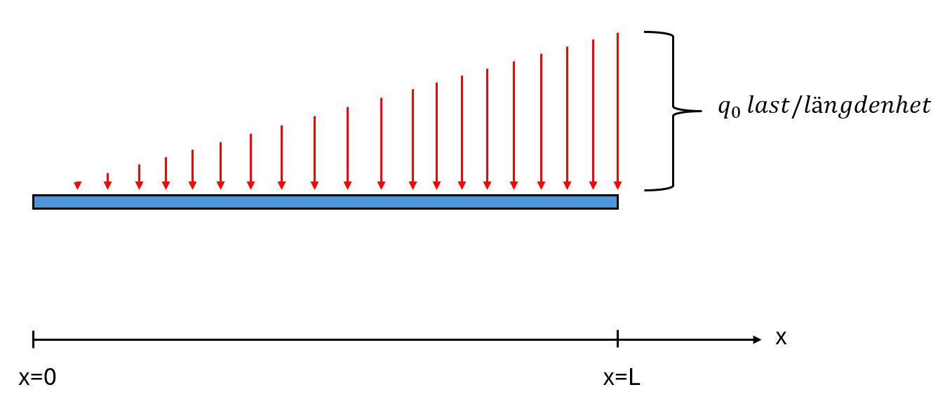 Kan du nu försöka dig på att räkna ut det resulterande vridmomentet på staven (till exempel kring punkten ) genom samma resonemang, dvs att titta på det infinitesimala vridmomentsbidraget på en liten del av stången och sedan addera (integrera) ihop alla små vridmomentsbidrag över hela stångens längd?