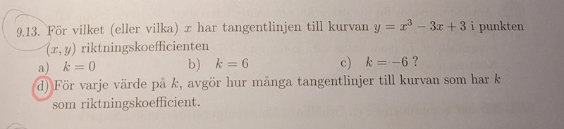Jag behöver hjälp med d). På de tidigare uppgifterna tog jag fram derivatan=k och löste ut vad x blev. Men hur kan man tänka på d)?