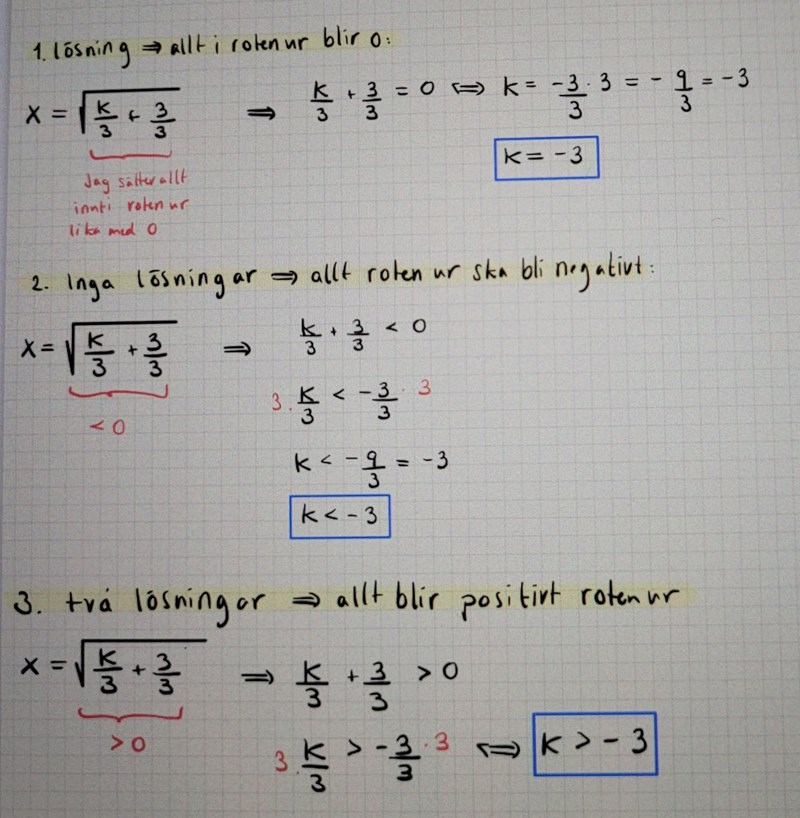 vilka k värden gör att ekvationen ovan har - en lösning - två lösningar - inga lösningar alls?
