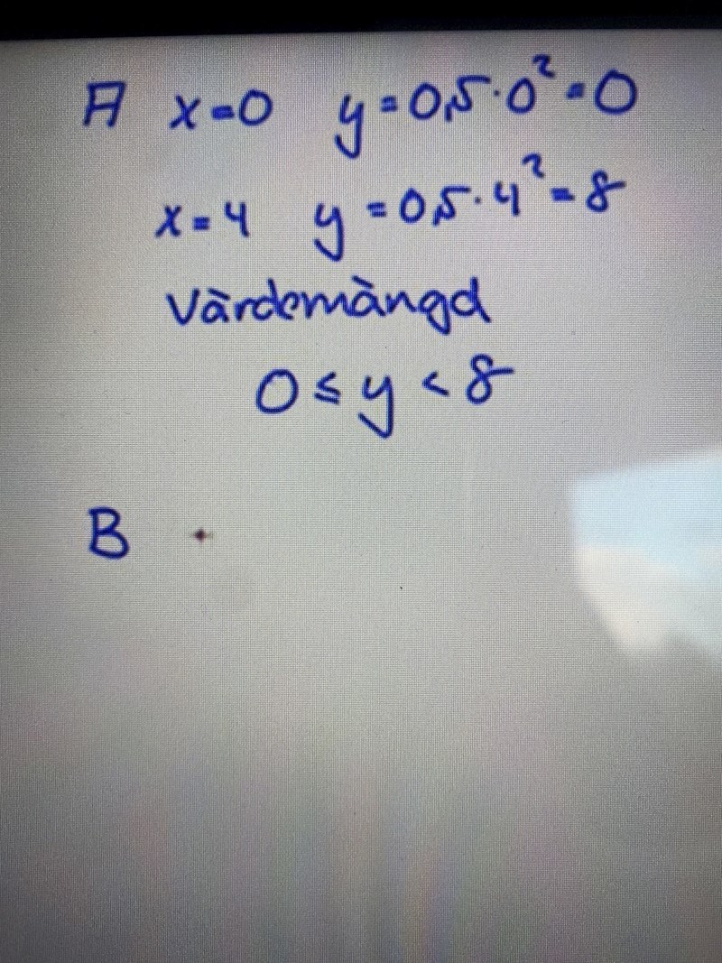 Men nu är definitionsmängden begränsad till x < 4 och därför blir värdemängden begränsad till y < 8.