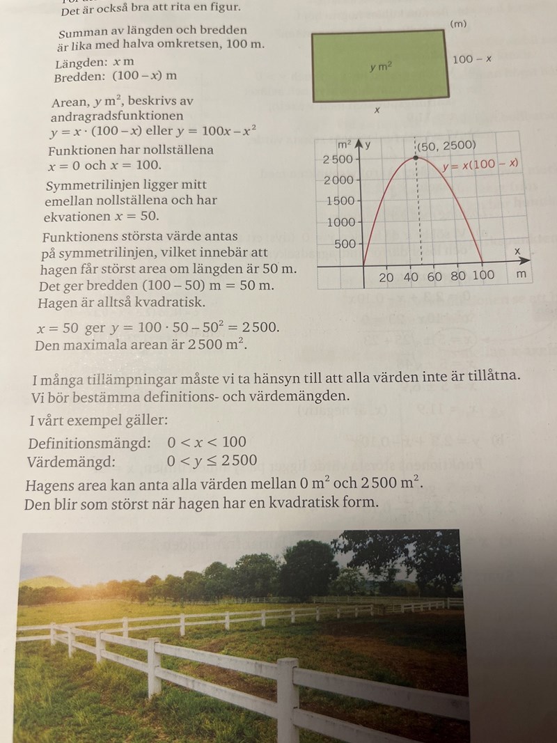 Hej, hur vet vi att y värdet ska vara i kvadratmeter och x i meter. Jag förstår inte och kan därmed inte förstå varför värdemängden blir som den blir.