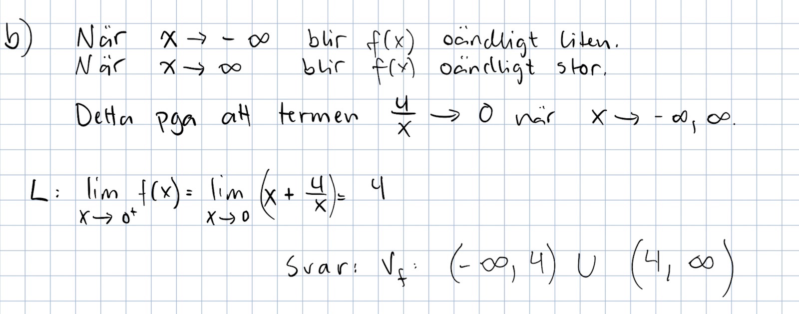 Ett alternativt sätt att fram värdemängden är att inse att värdemängden består av alla värden a sådana att ekvationen x + 4/x = a har en lösning som ligger i f:s definitionsmängd, som jag antar skall vara .
