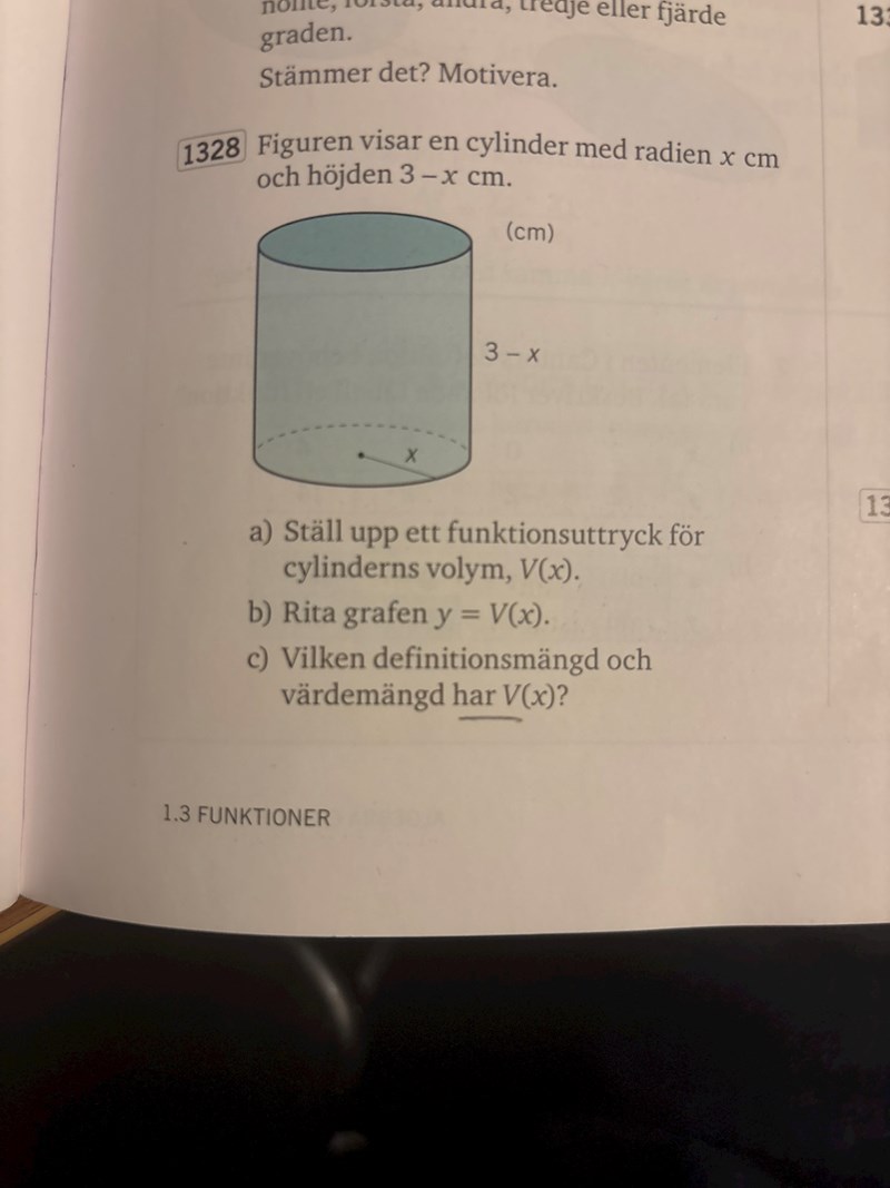 En cylinder med radien x cm och höjden (x-3) cm. Vad är definitionsmängden och värdemängden.