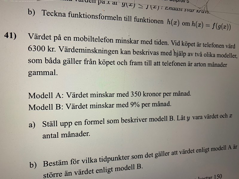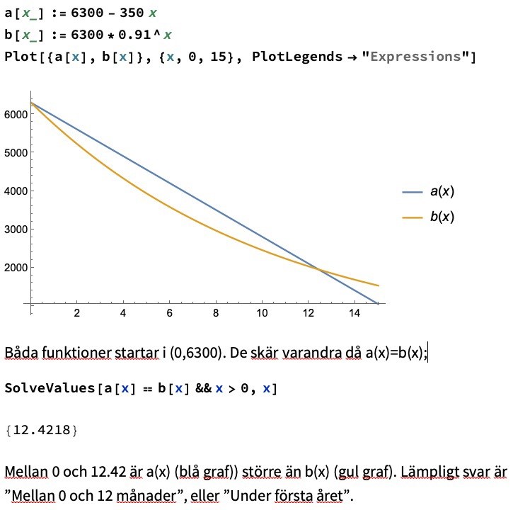 Om du sätter 6300 * 0,91^x = -350x + 6300 får du fram vid vilka x (vilka tidpunkter) värdet är detsamma för modell A och B. Sedan kan du titta före och efter de tidpunkterna för att se vilken modell som ger det större värdet.