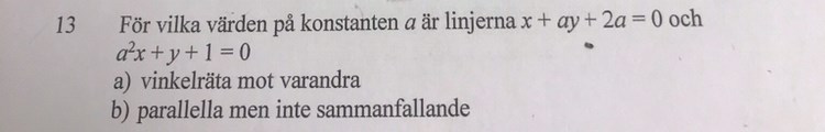 För att linjerna ska vara parallella men inte sammanfallande måste det gälla dels att , dels att . För dina , , och innebär det dels att , dels att . Olikheten är redan uppfylld, så då behöver du bara lösa ekvationen.