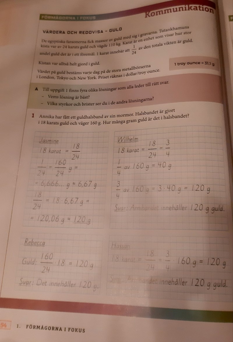 Om vi tar den första frågan: Detta ser ut att vara en fråga där man ska utgå från sitt eget perspektiv. Jag försökte lösa problemet först själv, innan jag gick vidare till vad dom faktiskt frågar efter. Min uträkning var likadan som Hassans. Man kan då tänka sig att säga hans uträkning är bäst. Men varför? Det duger väl inte att säga "för att jag gjorde samma sak", eller? Något annat som jag skulle tänka mig är att säga den lösningen som är smidigast. Ju fortare man gör en uträkning desto mer tid sparar man. Dessutom är dom kortare lösningarna enklare att förstå. Fast tid har väl ingen koppling till något av detta. Det kanske tog Wilhelm mindre tid att lösa frågan än Rebecca? Och alla förstår uträkningarna på olika sätt. Så vad säger man då?