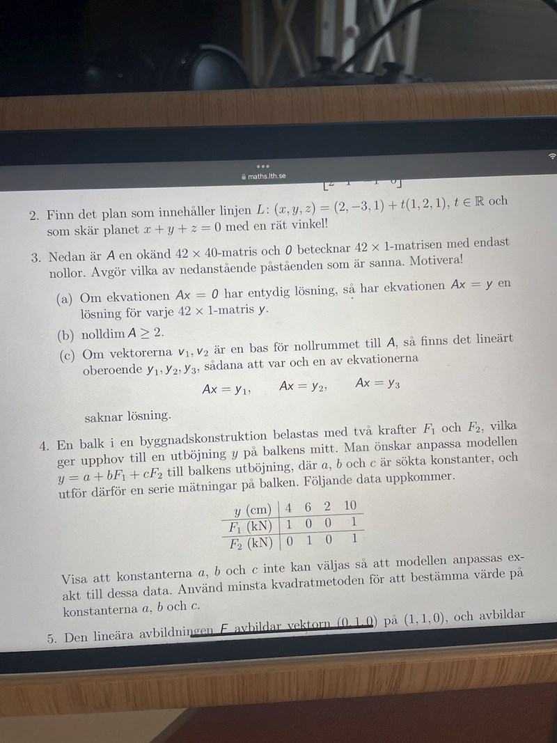 Jag vet det. Så om vi är på exemplet i bilden är alltså rang A = 38. Då kan man skapa 4 linjärt oberoende vektorer till (vi är ju i R^42). Alltså är påståendet sant. Men om vi tänker djupare på det är exemplet i R^3 ovan enklare. Då är värderummet en linje. Jag försöker rita upp det, men det känns som att jag kan skapa fler är 2 linjärt oberoende vektorer som inte är på linjen.