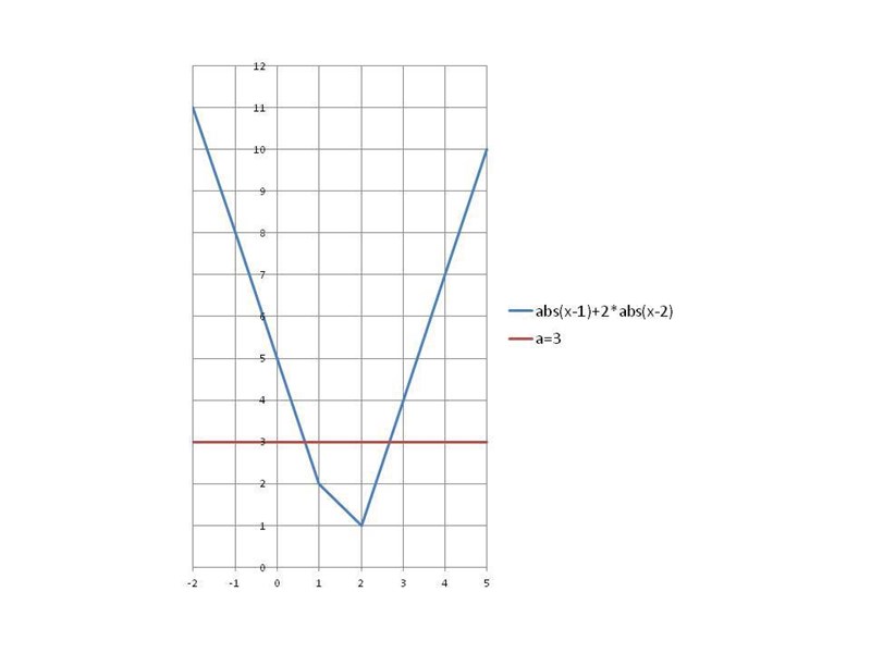 Eftersom absolutbelopp aldrig är negativa så är talet |x-1|+2|x-2| |x-1|+2|x-2| aldrig negativt. Därför måste det gälla att a0 a \geq 0 . Fallet a=0 a = 0 är omöjligt eftersom då måste |x-1|=0 |x-1| = 0 och |x-2|=0 |x-2| = 0 samtidigt; alltså måste det gälla att a>0. a > 0.