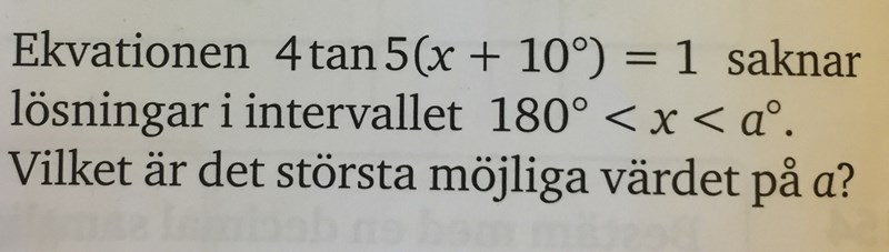 Rita en tallinje som sträcker sig från 180° och uppåt. Markera intervallet från 180° till a. Detta intervall ska inte innehålla en lösning till ekvationen. Flytta nu a så långt till höger som det går, utan att det dyker upp en lösning i intervallet.