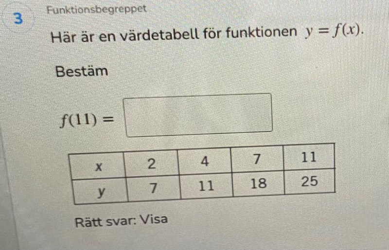 Smaragdalena skrev:Läs av i tabellen vilket y-värde som motsvarar x-värdet x = 11.