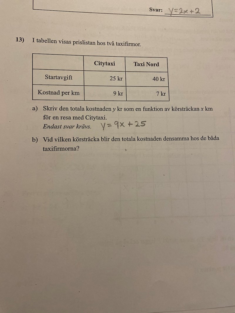 Skriv upp en liknande funktion för det andra taxibolaget. Deras kostnader blir densamma då du likställer dem. Lös ut x.