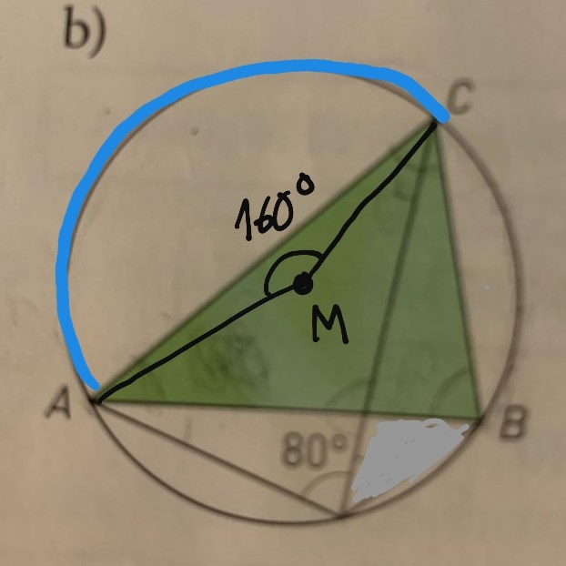 Blir då inte den markerade svarta vinkeln 80 grader?(den jag ritade). Men hur kom du fram till att M=160 grader?